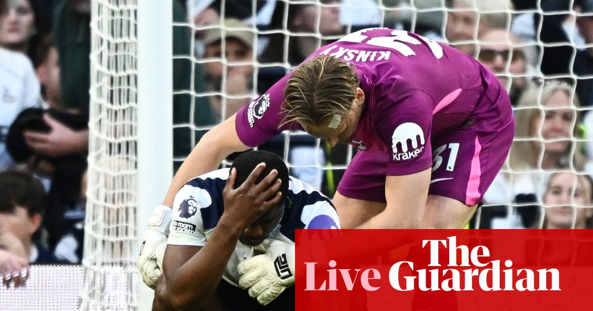 ⚽️ Premier League updates from the 5.30pm BST kick-off ⚽ Live scores | Latest tables | Top scorers | Email Simon 5 mins: A big punt forward from Kinsky towards Solanke, who seems to pretty deliberately take out van Hecke. They both go down and the ball bounces forward, with Simons haring after it. He’s not far away from getting it, either, but Verbruggen comes out to huff it away in the nick of time. Again, the referee lets play continue. 3 mins: Lots of people running around as the game starts with a high tempo. But then Danso stops Minteh completing a one-two and thereby concedes a free-kick on halfway.