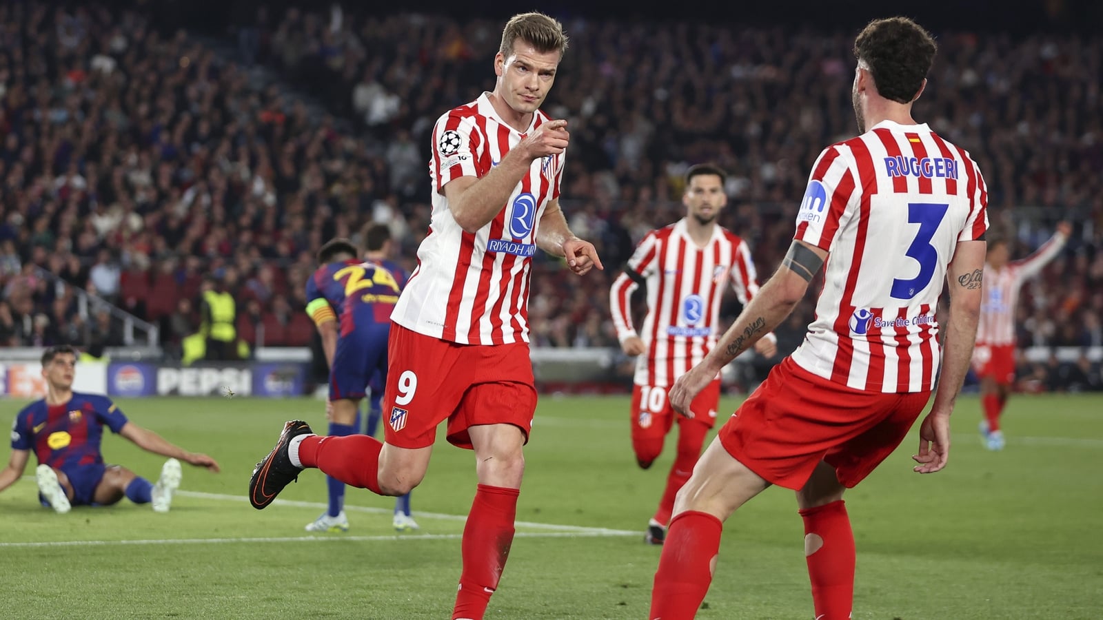 Julian Alvarez and Alexander Sorloth give Atletico Madrid a 2-0 victory over 10-man Barcelona in their Champions League quarter-final first leg at the Nou Camp.